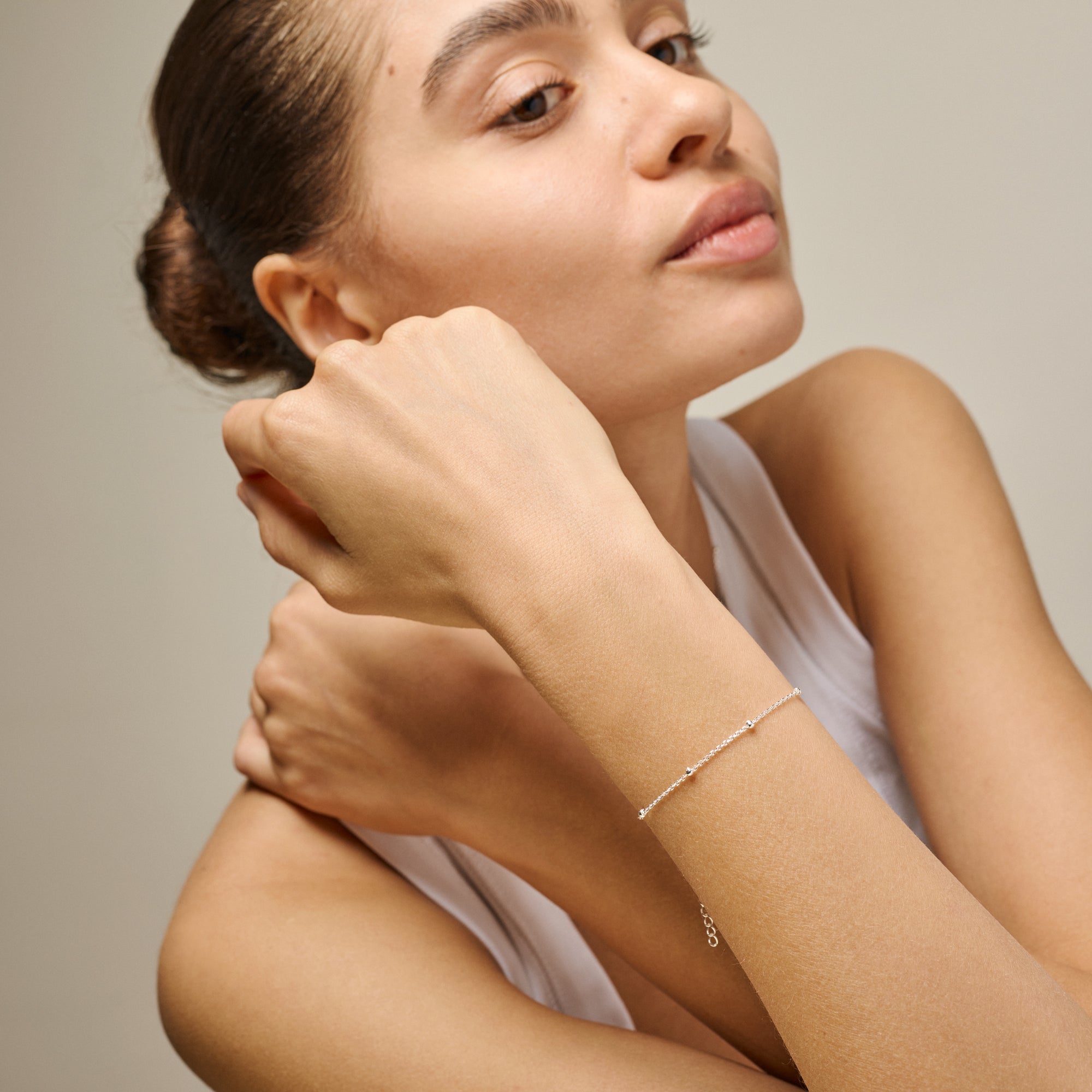 About the jewelry: Beaded Chain Bracelet is a simple and feminine bracelet with small, evenly distributed silver beads along a fine chain. The minimalist design makes it easy to wear on its own but also ideal for a layered look. The small beads add a discreet interplay and an elegant rhythm to the bracelet. Also available as a necklace, as well as gold-plated.