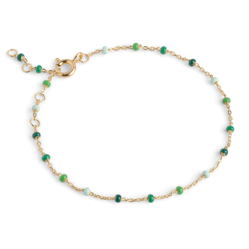 Experience the vibrant colors of spring with the Lola bracelet in Spring. This unique jewelry highlights blue and several green shades, reminiscent of blooming flowers and fresh foliage. The delicate chain bracelet is perfect for a layered effect and can be combined with other bracelets to create your personal style. The Lola bracelet is made of sterling silver and plated with 18K gold. The colored enamel beads are hand-painted and add color to your wrist.