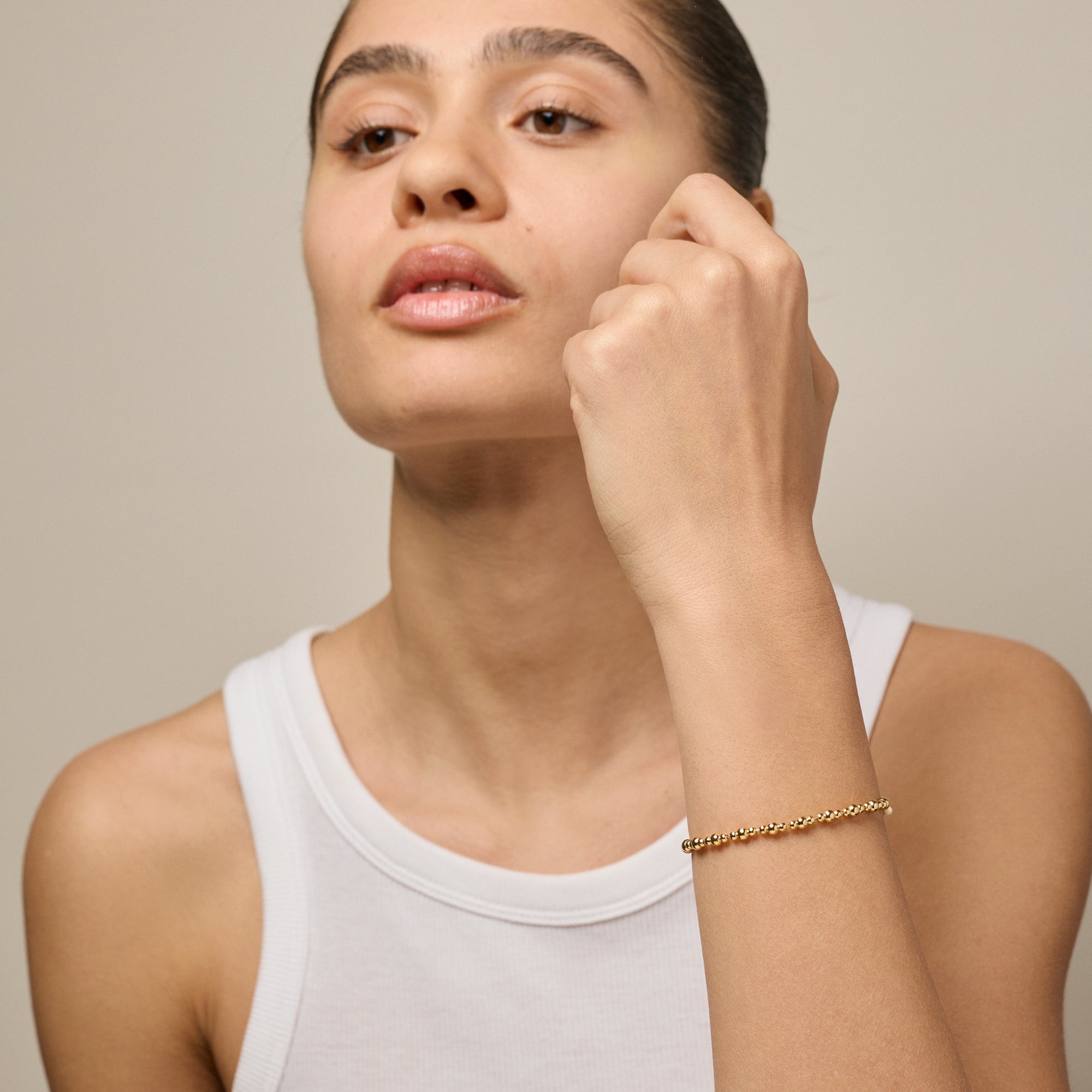 Norma Bead Bracelet is an elegant and playful bracelet composed of small, polished gold beads in different sizes. The subtle variations create an organic flow and give the jewelry a feminine and refined expression. A small beige enamel bead at the clasp adds a discreet and charming twist.Perfect alone - or in a mix with other bracelets for a personalized look.