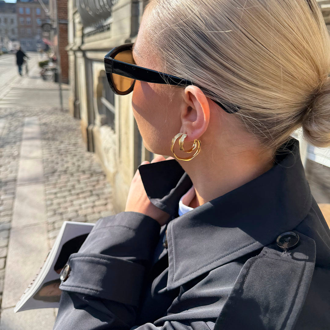 Our Ane large hoops are big and voluminous and easy to combine with any outfit. If you like to do a little extra, you can add a pair of Ane hoops to your everyday jeans. The Large Ane hoops are of cause an obvious choice for all kind of festive occasions with their chunky, exclusive design. Ane comes in gold and silver and is also to find in a smaller edition.