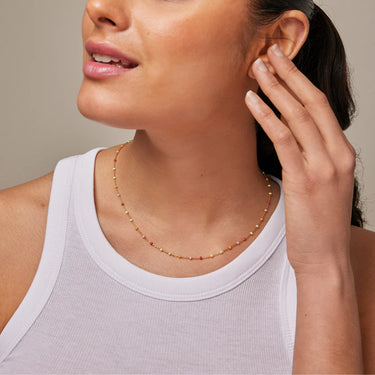 The Lola Rainbow bracelet and Lola Rainbow necklace bring the shades of the rainbow to life through delicate, coloured enamel details. The small touches of colour create a bright and feminine expression that feels both playful and balanced.