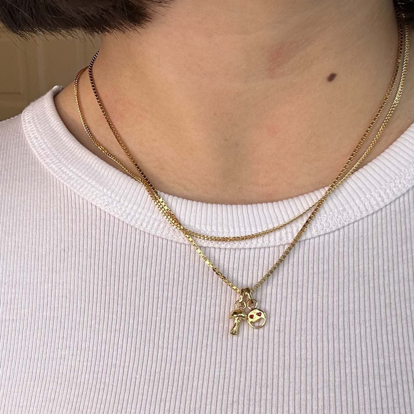 The Box Chain plated with 18 karat gold, is a square chain type that looks cool and distinctive with a shiny finish. The gold necklace is simple and has a long adjustable piece, making it perfectly complementary and easy to position in relation to others. The gold-plated Box Chain is available in a thinner chain type and also in silver.