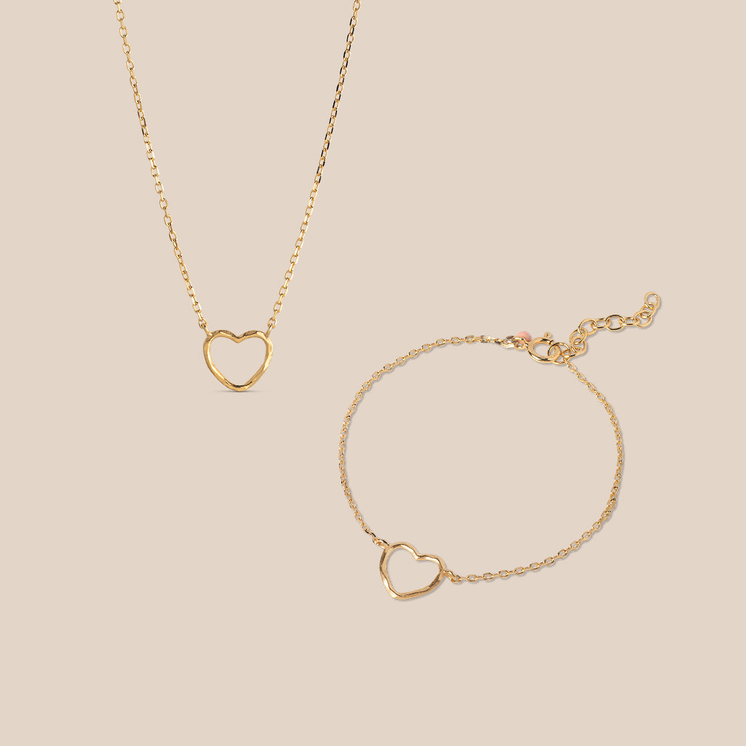 A timeless and elegant jewellery set that is easy to give and a joy to receive. The organic heart shape on both the necklace and bracelet creates a warm, feminine expression. Style them together or wear them individually – perfect for any jewellery collection.