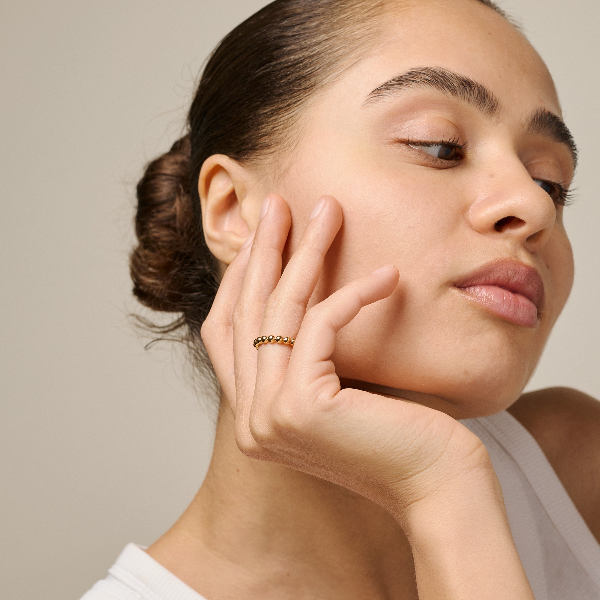About the jewelry: Ball Ring in 18k gold-plated 925 sterling silver is an elegant and cool finger ring that matches our popular ball hoops. The design is simple and classic, but with the small beads, the ring gets a modern and distinctive expression. It is adjustable and can easily be customized to fit your finger perfectly – perfect for both everyday and layering with other rings.