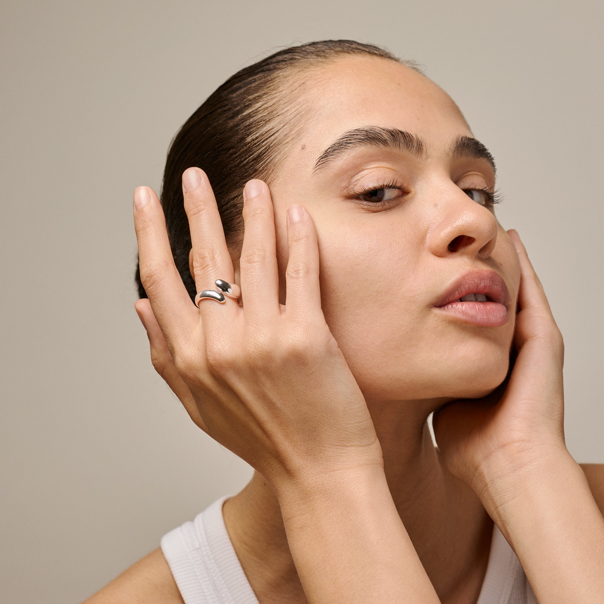 About the jewellery: The Neli Ring, made of 925 sterling silver, is designed with inspiration from the gentle movements of nature. It boasts an elegant, open silhouette with voluminous shapes that envelop the finger. The polished surface provides an exclusive and modern look, while the adjustable size ensures a perfect fit for you, whatever the occasion. The Neil ring is also available plated with 18 karat gold.