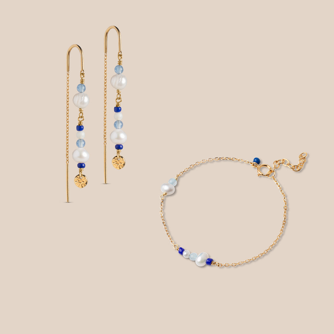 The Sofia earrings and bracelet in Marine combine rich blue tones with delicate pearls, creating a look that feels both calm and refined. The darker shades add depth and character, while the pearls bring a soft, feminine contrast.