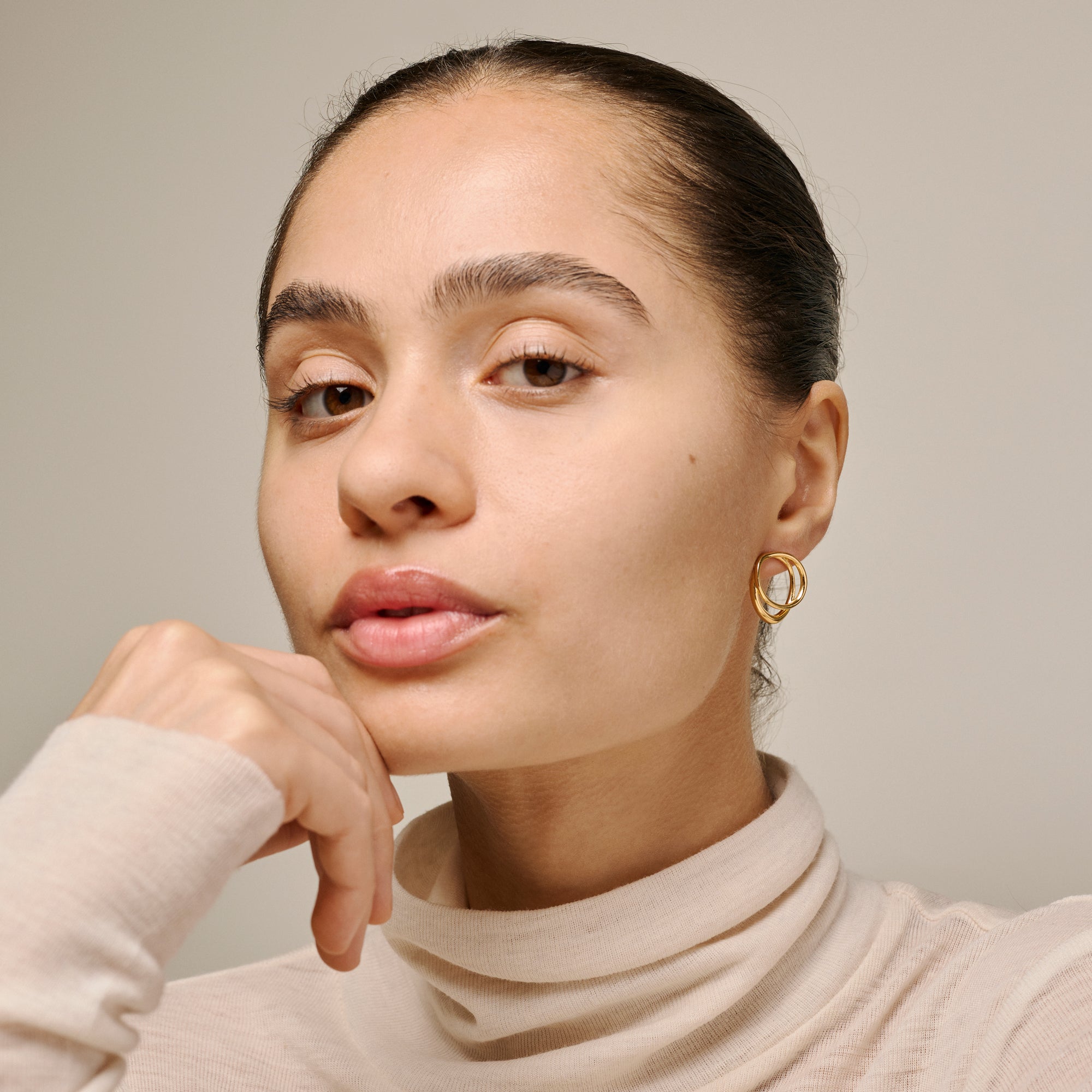 About the jewelry:Bellu Stud is an elegant and organic interpretation of the classic circle. The two soft rings are gently twisted and wrap around each other in a harmonious and modern design. The earrings have a sculptural expression, yet still simple enough to be worn every day. A piece of jewelry that balances sophistication with coolness.