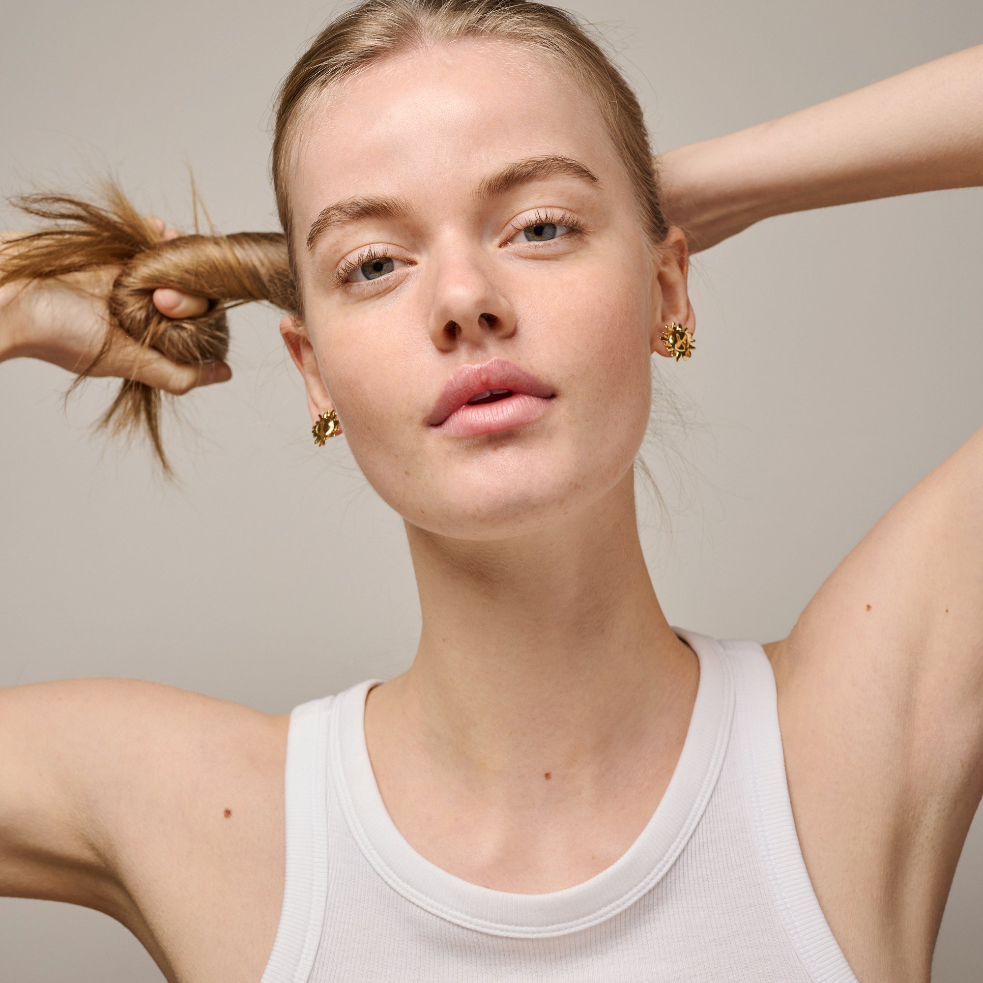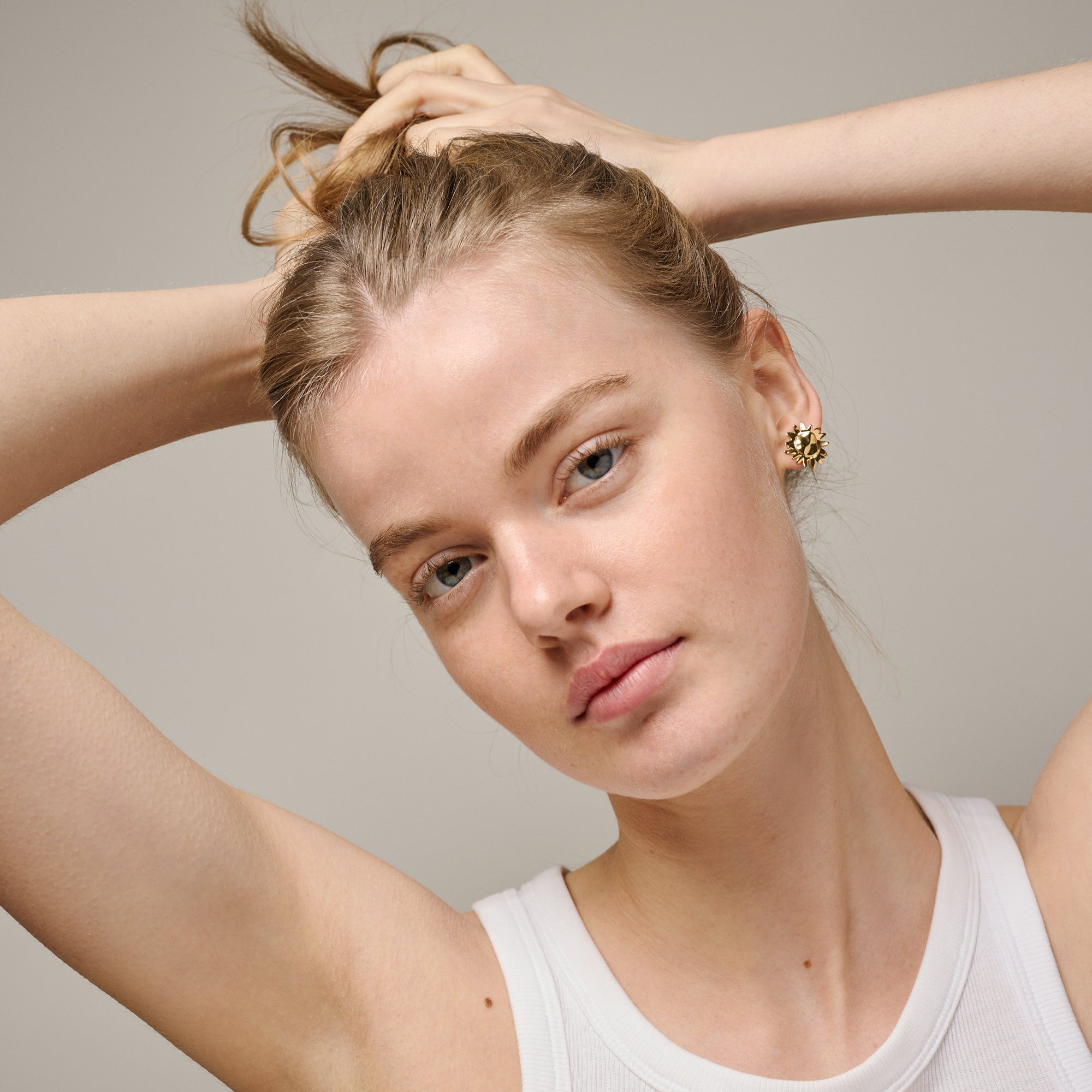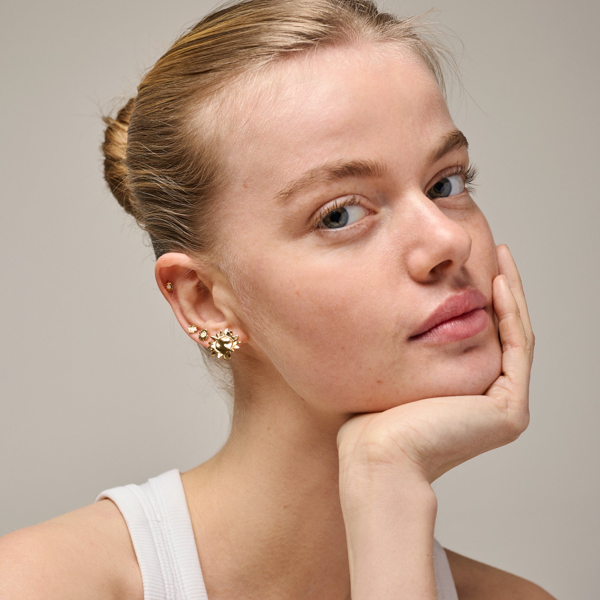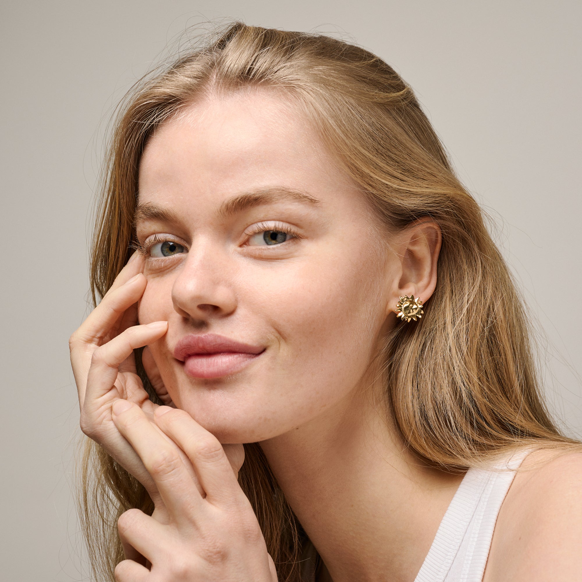 About the jewelry:Sunshine studs in the largest version are gold-plated with 18-carat gold and have a more statement character than the other sizes, as they fill the earlobe nicely and create a feminine and festive look. Sunshine studs Large represents a voluminous sun or sunflower, depending on the eyes that see.